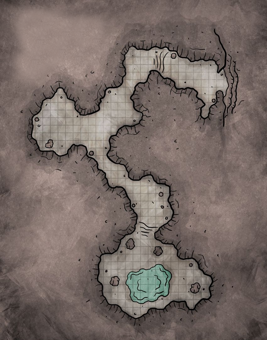 The cave was narrow—a long, claustrophobic hallway of worked stone. One small side chamber branched off, and beyond that, a larger room supported by two crude pillars and a small, dark lake. |