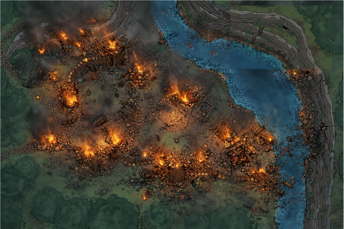The bandit camp fell quickly and without mercy. What little resistance remained was scattered or silenced as the party swept through the tents and crude fortifications. Weapons were stripped from the fallen, coin and supplies gathered without ceremony. When there was nothing left worth taking, the decision was made—torches were thrown, and the camp was put to the flame. By the time the fire took hold, smoke curled into the treetops and the camp became nothing more than a burning scar along the riverbank. |